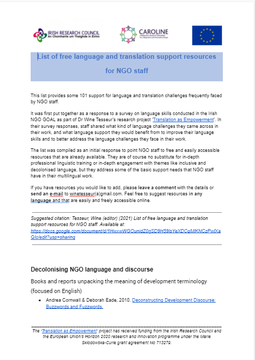 - Wine Tesseur, Sharon O’Brien, Enida Friel (2022) Language diversity and inclusion in humanitarian organisations: Mapping an NGO’s language capacity and identifying linguistic challenges and solutions. Linguistica Antverpiensia 21. Article accessible on Open Access here.